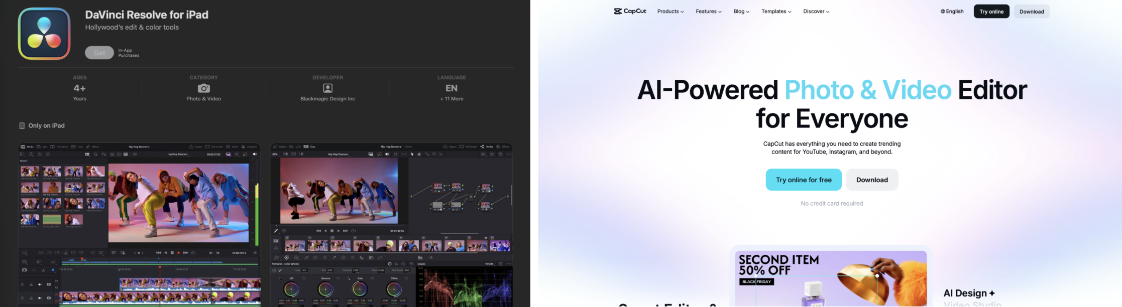 Video editing | DaVinci Resolve, CapCut | DaVinci Resolve (free), CapCut |