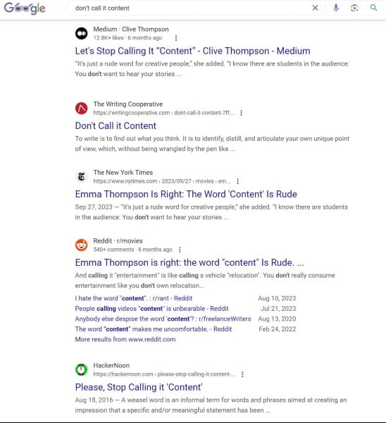 From time to time in one of my social media feeds, I’ll see an earnest poster bemoaning the word “content.” “Don’t call it ‘content,’ it’s art!” a painter or a musician might tweet, before dozens or hundreds of followers like the post and respond with approval. Emma Thompson, a writer/director/actor I admire greatly, recently made the same point, insisting the word is rude and creatives shouldn’t tolerate it. And a quick Google search for the phrase “don’t call it content” will bring up plenty of columns on Medium and other sites where different writers expound at length on the soulless nature of the term.