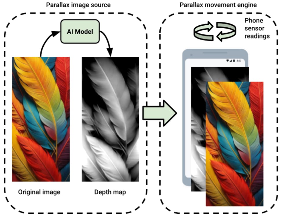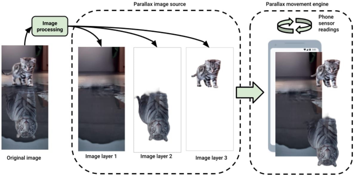 For depth maps, we use a deep learning model for depth estimation from a single image. Each depth map is generated just once, the first time a user requests it, and is then cached for future use by other users. Finally, the depth map and the original image are transformed using displacement mapping techniques combined with phone movement readings. Original image pixels are moved dynamically based on depth value and sensor directions. The result is that a flat image becomes a 3D environment.